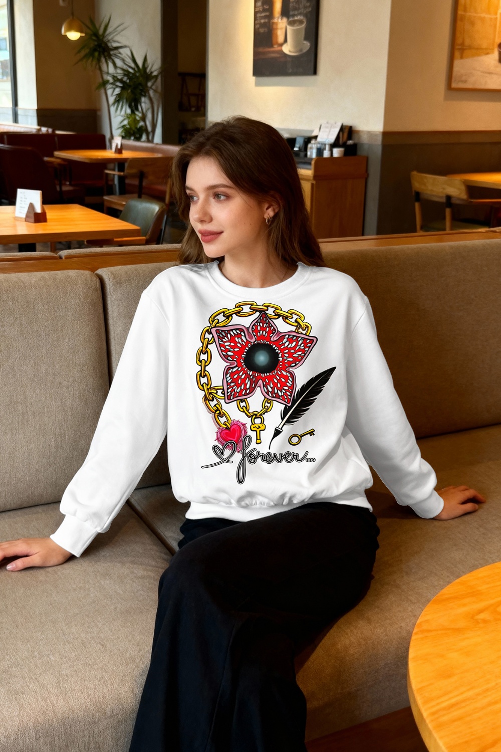 Fall in love with this sweet Stranger Things hoodie designed for couples. Inspired by vintage romance, it features a dreamy flower, delicate chain, feather, and a heartfelt "forever" print. Made from ultra-soft fabric, it’s perfect for cozy café dates and creating timeless memories together.