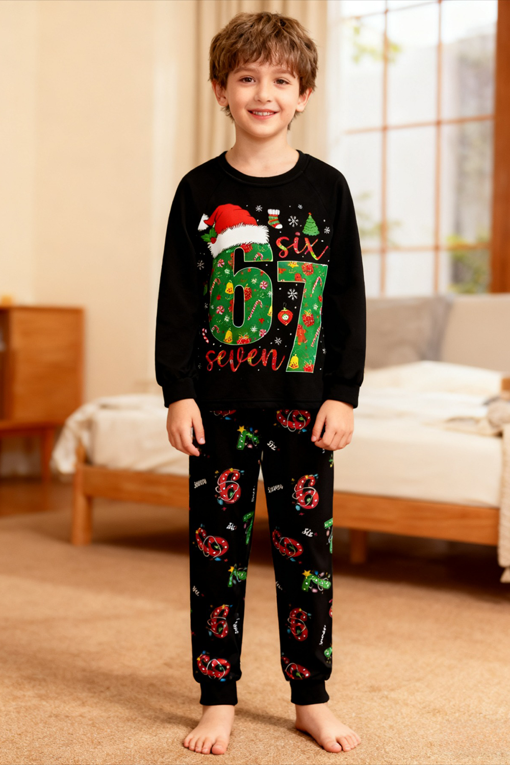 Made from super-soft fabric, this pink two-piece features playful "six" and "7" prints with a tiny Santa hat, plus festive patterns of trees and gifts. Perfect for cozy moments, holiday photos, and making magical memories! These unique SIX SEVEN pajamas make the ultimate holiday gift.