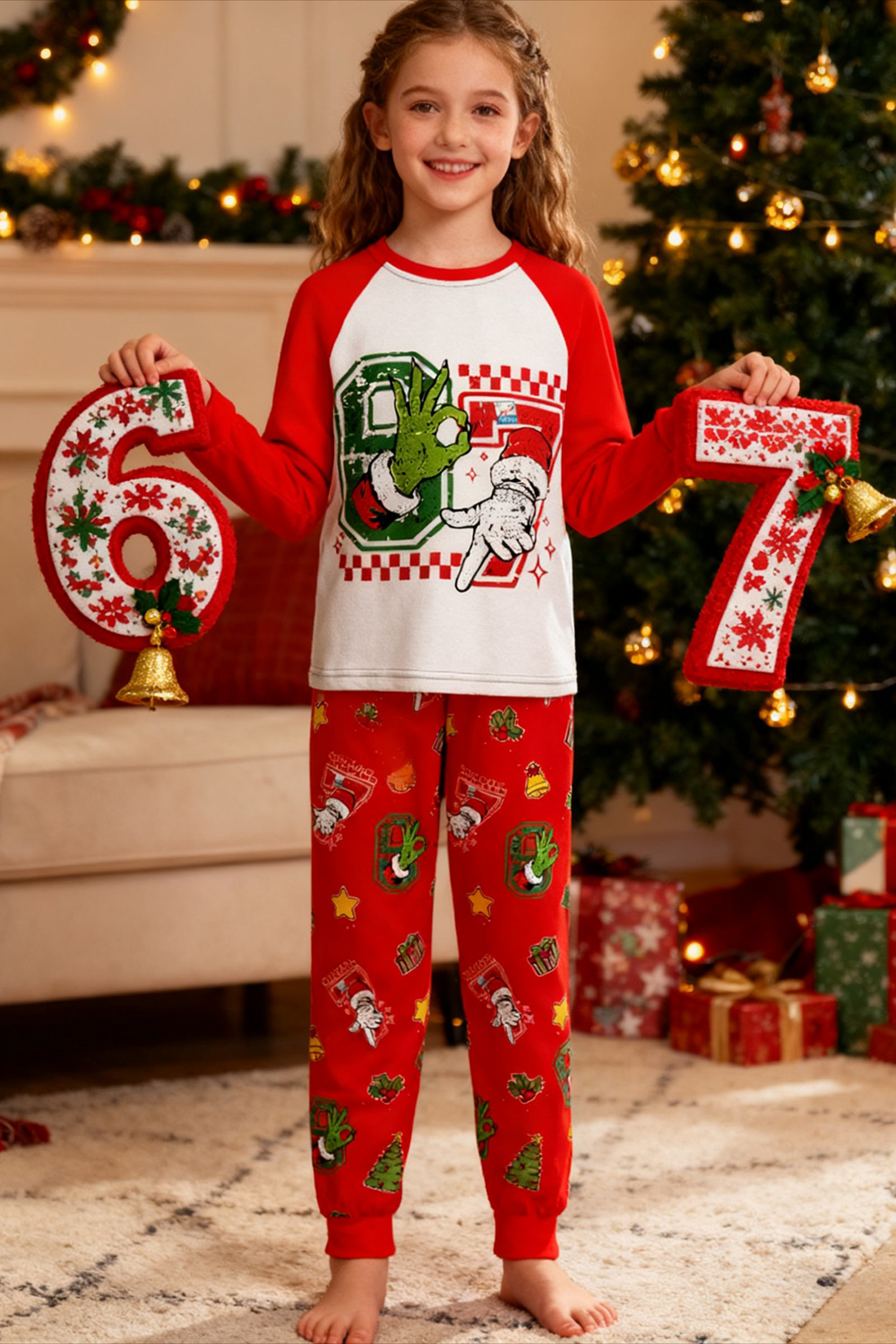 This awesome black set features a light-up green monster hand and Santa giving a SIX SEVEN, with pants full of festive prints. Super soft, fun to wear, and perfect for making Christmas morning magical! These unique SIX SEVEN pajamas make the ultimate holiday gift.
