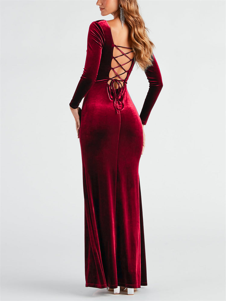 This formal velvet mermaid dress is a chic choice for an elegant affair. She features a sweetheart neckline with a draped cowl accent, long fitted sleeves, a structured corset-designed bodice, a partially open back with a lace-up design, and a fitted, floor-length, mermaid silhouette with a high side slit.