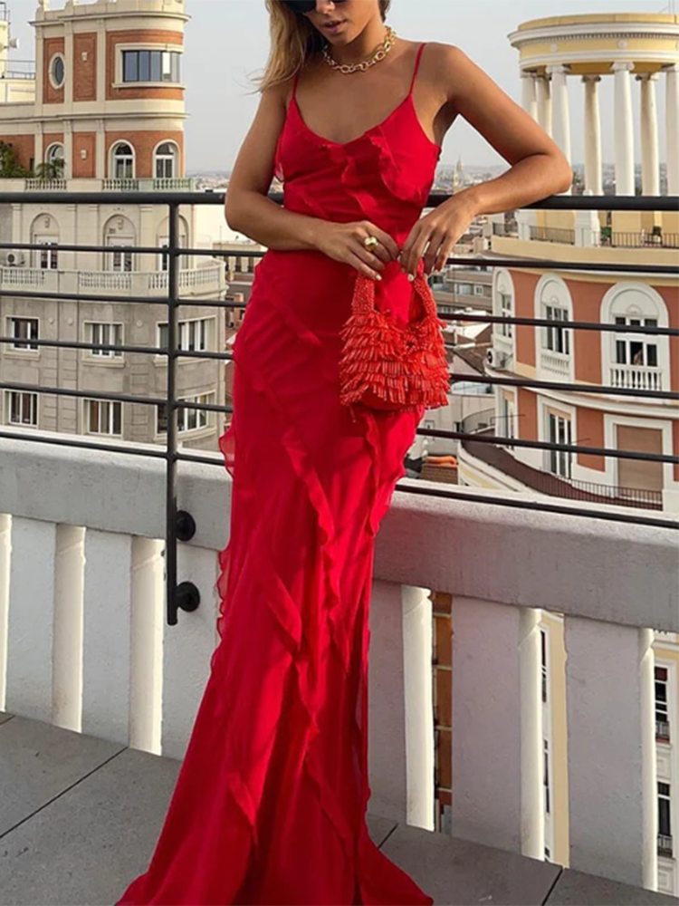 Flirt with frills this season in our extremely striking maxi dress. Uber seductive, it features a spaghetti straps with bust flattering plunge neckline and dramatic maxi length skirt with front split and elegant waterfall ruffle detailing. She's a little provocative and a lot of fun, this forever stylish number will have you turning heads at every corner. Drape an oversized blazer over your shoulders to keep out the evening chill, perfect for those summer parties, you wont be able to resist wearing it again and again...