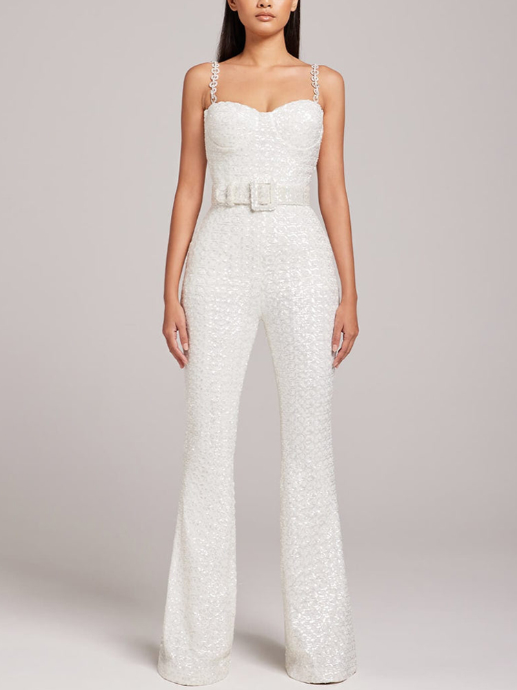 This jacquard diamante strap flared jumpsuit with belt, made from our exclusive pearl white shimmer sequin, designed with an underwire bustier to give structure and compliment your shape.This style comes with removable Diamante straps and looks equally as good with or without the detachable belt.