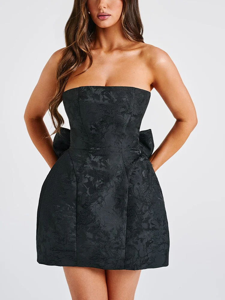 This Jacquard Strapless Knot A-line Mini Dress is perfect for your next party. Its structured design and strapless neckline will make you stand out, while the jacquard fabric adds a touch of elegance. Dress it up or down for any occasion and make a statement with this versatile piece.