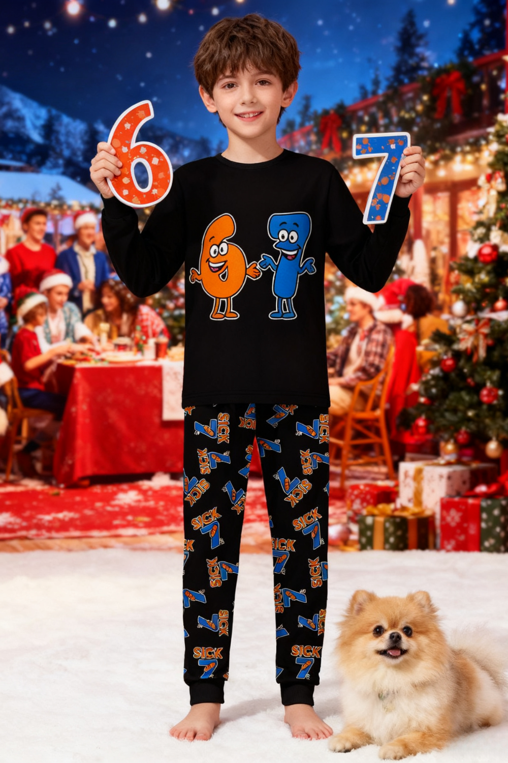 Capture the magic of the holiday season with our adorable "67" Christmas Pajamas! This charming two-piece set is designed to make your little one the star of Christmas morning. Picture the joy as they unwrap gifts under the tree, dressed in these festive and super-soft pajamas, creating memories that will last a lifetime.These unique SIX SEVEN pajamas make the ultimate holiday gift.