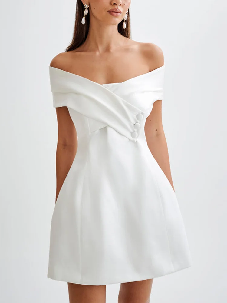 Effortlessly turn heads with our Satin Off Shoulder Button Front Mini Dress. Designed for parties, this dress creates a charming silhouette with its off-shoulder style and front button detailing. Made with silky satin fabric, it offers a luxurious and comfortable feel, while ensuring you stand out in any event.
