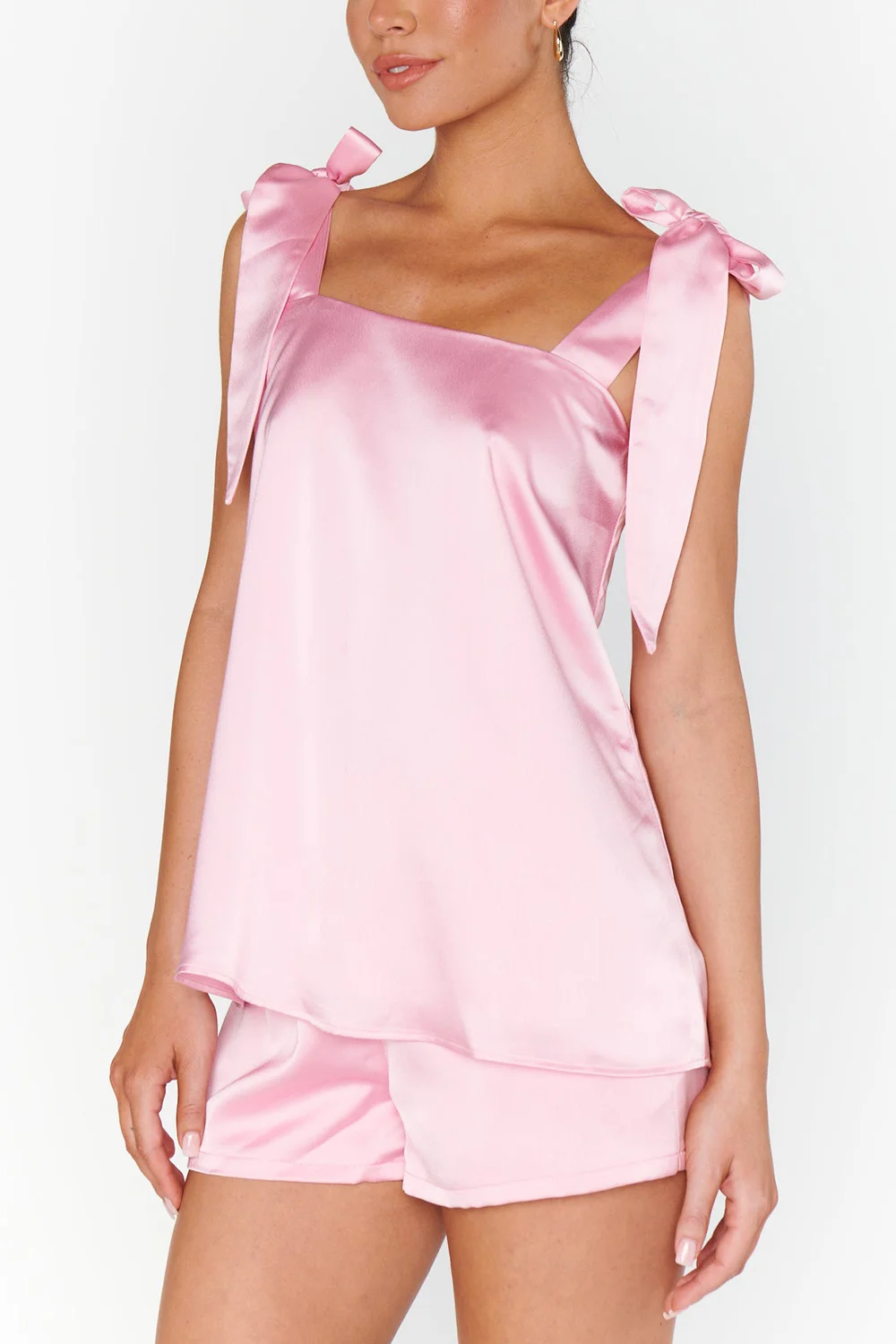 Silk Shoulder Strap Pajama Set exudes elegance and comfort with its luxurious silk fabric and delicate shoulder strap design. Features a sleeveless top,  paired with matching shorts. The soft, smooth texture of silk provides a breathable and lightweight feel, perfect for warm nights or relaxed lounging.
