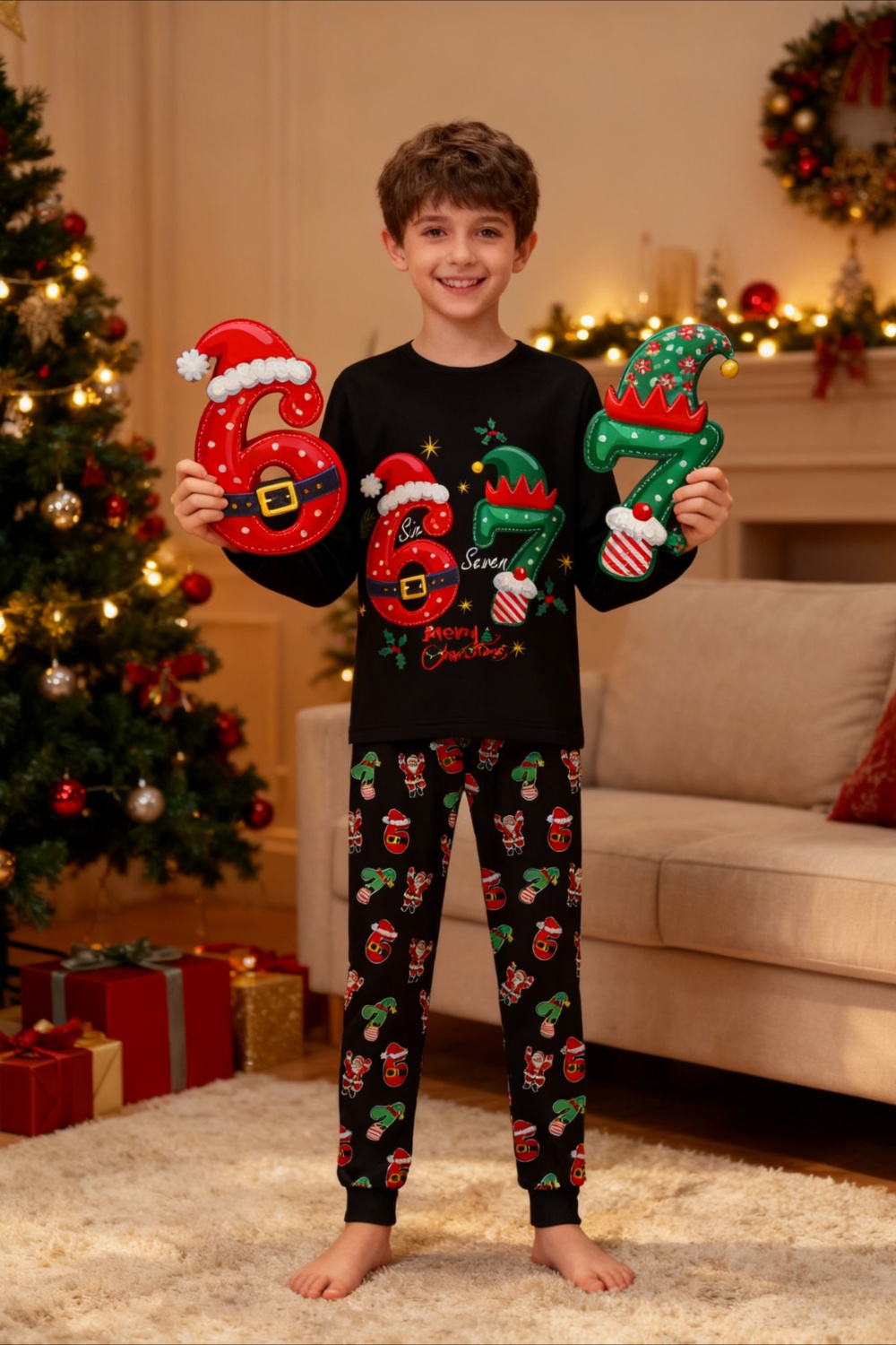 This awesome black set features a light-up green monster hand and Santa giving a SIX SEVEN, with pants full of festive prints. Super soft, fun to wear, and perfect for making Christmas morning magical! These unique SIX SEVEN pajamas make the ultimate holiday gift.