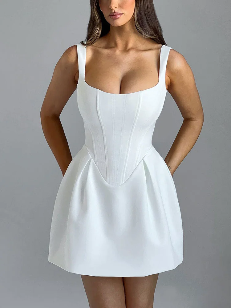 Expertly constructed with a square neckline and corset detailing, this sleeveless A-line mini dress is both elegant and versatile. Perfect for graduation ceremonies and other special occasions, this dress offers a flattering fit and a timeless style.